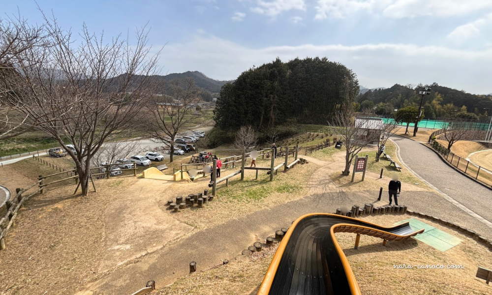 棚田のような段々の地形を活かしてつくられた公園で、遊びながら明日香らしい風景も感じられるのが魅力。