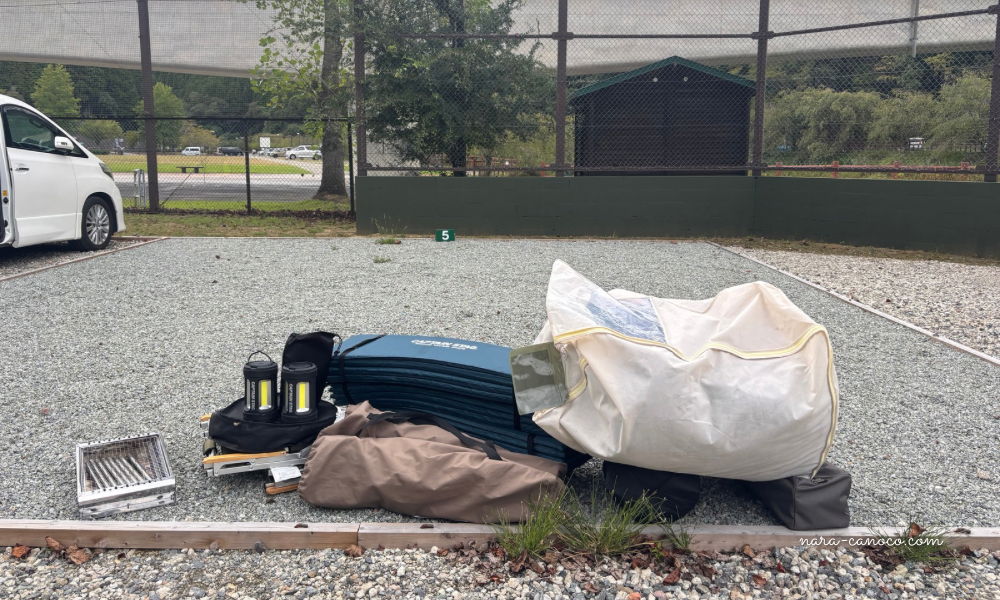 夜中の豪雨が心配だったのですが、区画に敷き詰められた砂利のおかげで水捌けがよく、足元がぬかるむ心配がありませんでした。