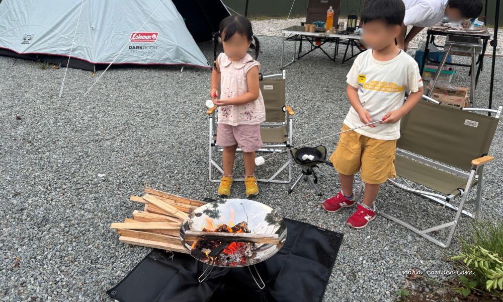 焚き火台に火を灯してくれたので、焼きマシュマロに挑戦しました。