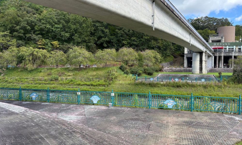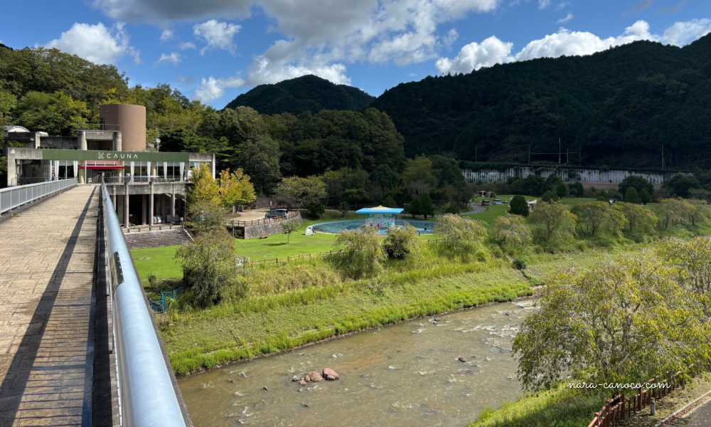 「CAUNA Nara Uda(キャウナ 奈良宇陀)」は、川沿いの開けた公園の中に位置します。