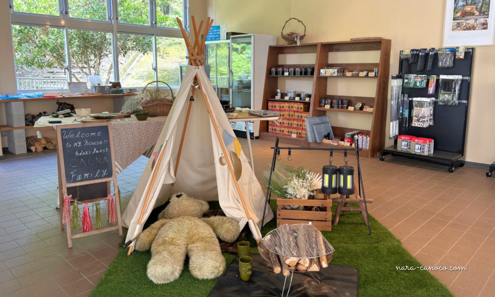 「CAUNA Nara Uda(キャウナ 奈良宇陀)」では受付横に売店があり、着火剤や薪などのキャンプグッズほか、花火を販売しています。