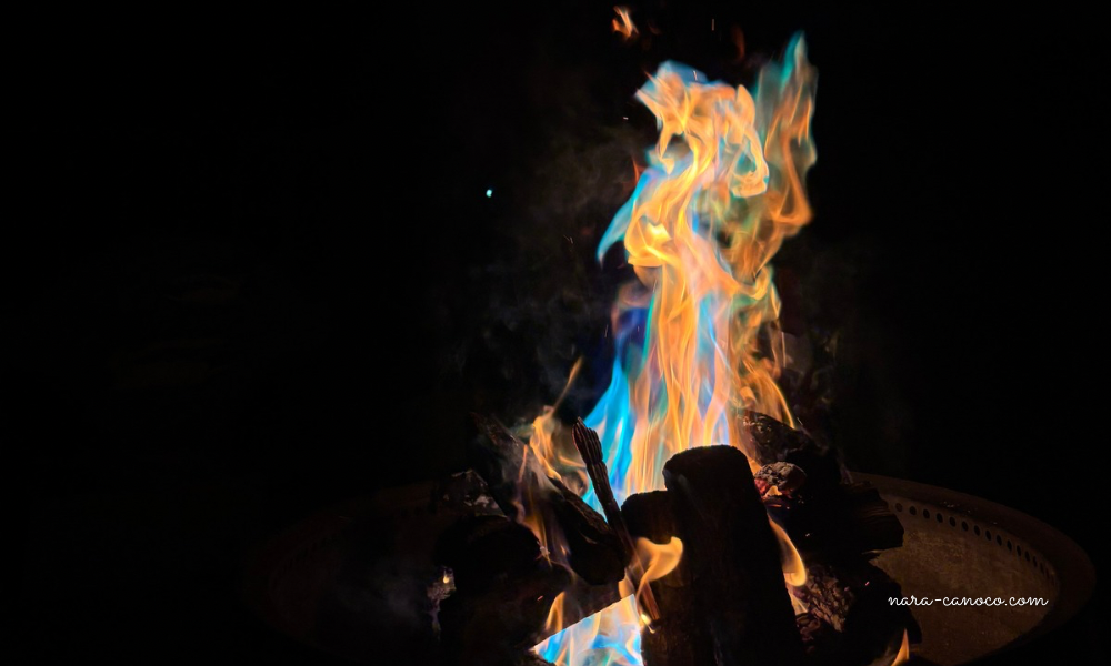 キャンプファイヤーは赤やオレンジだけでなく、緑や青に見える不思議な炎で、「魔法の火!」と目を輝かせながら見つめていました。