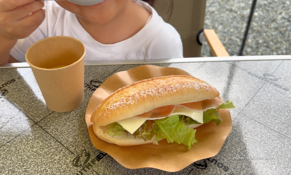 家から持参したパンに、チーズやハムなど具材を挟んでサンドウィッチを作りました。