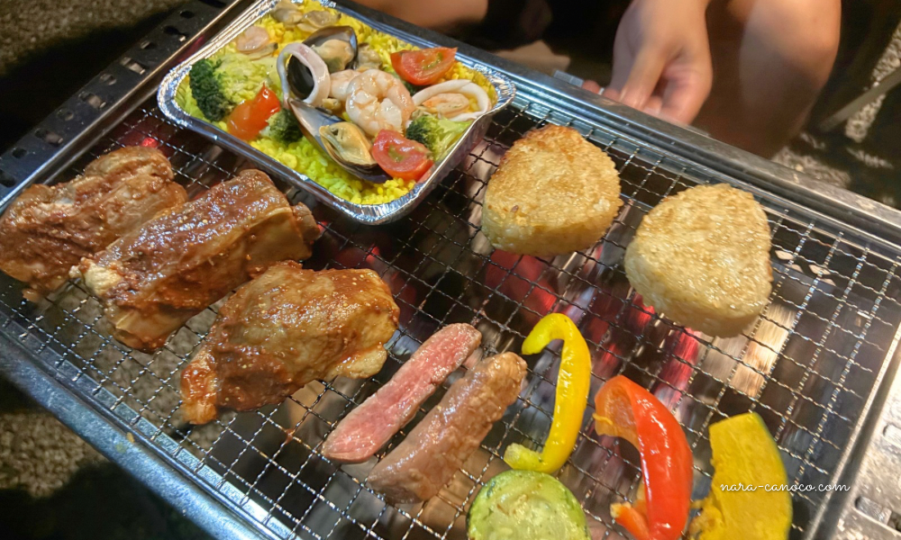 お肉(ジャークチキン、タンドリーチキン、テキサスBBQ、ポークスペアリブ)や野菜、焼きおにぎり、じゃがバターがセットになったプランがあるので、大人3人前、キッズ1人前、パエリアを事前に注文しました。