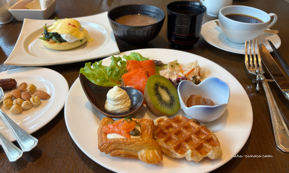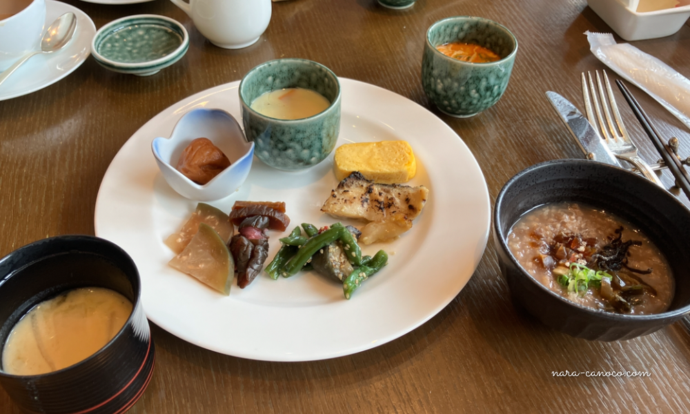 1階「シルクロードダイニング」でのビュッフェは、三輪そうめん、茶粥、奈良漬など地元食材が楽しめ、洋食メニューやデザートも充実。