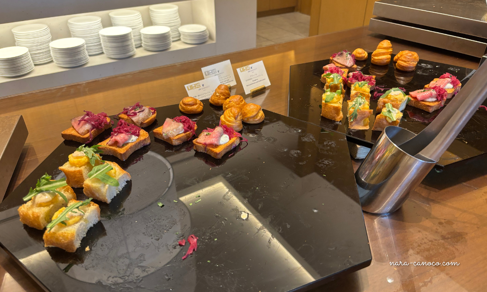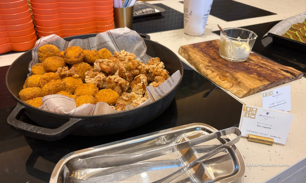 フィンガーフードやミニパンケーキ、三輪そうめん、唐揚げなど、十分食事がとれるので、お昼はラウンジで済ませてもよかったなと思います。