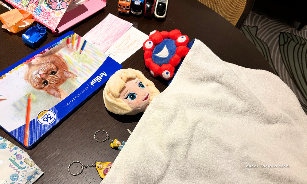 また、ターンダウンサービスの後、子どもたちが出しっぱなしにしていたぬいぐるみが綺麗に並び、タオルのお布団までかけてくれていたことに驚き…!
